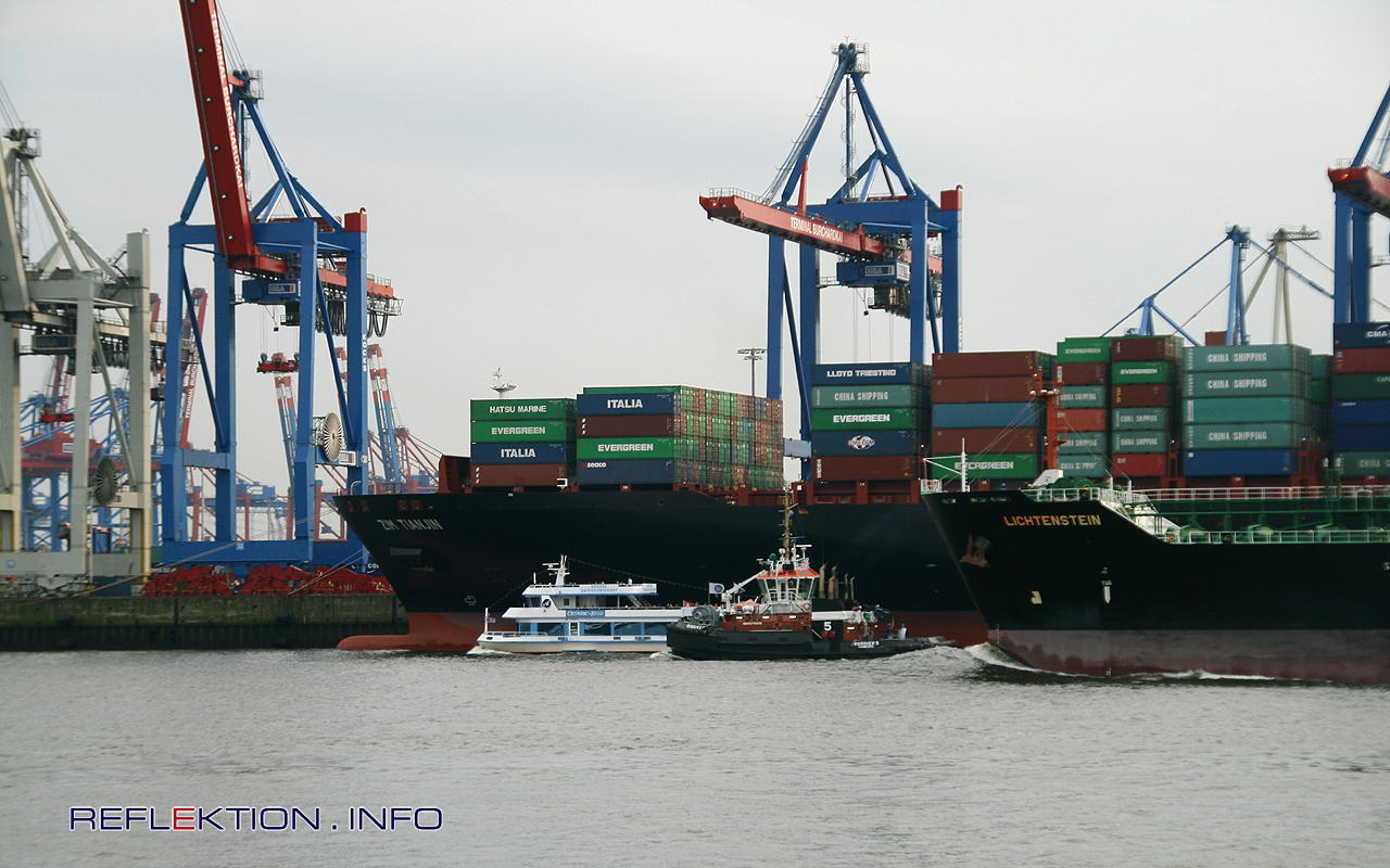 Schiffsquartett Gar nicht so selten ist solche Formation im Hauptfahrwasser der Elbe im Hamburger Hafen zu beobachten. Am Kai des Containerterminal Burchardkai hat der 349 Meter lange Containerfrachter ZIM TIANJIN (116.500 Tonnen, 10.062 20-Fuß-Container, Bj. 2009) festgemacht. Das Ausflugsschiff OLYMPIC STAR ( 34,26 Meter lang, 500 PS, 250 Passagiere, Bj. 2003) fährt elbaufwärts Richtung St. Pauli Landungsbrücken und wird vom Assistenz-Schlepper BUGSIER 5 (28 Meter lang, 6350 PS, Bj. 2008) überholt. Beide wiederum haben soeben den einlaufenden Tanker LICHTENSTEIN (182 Meter lang, ) überholt. (von links nach rechts)