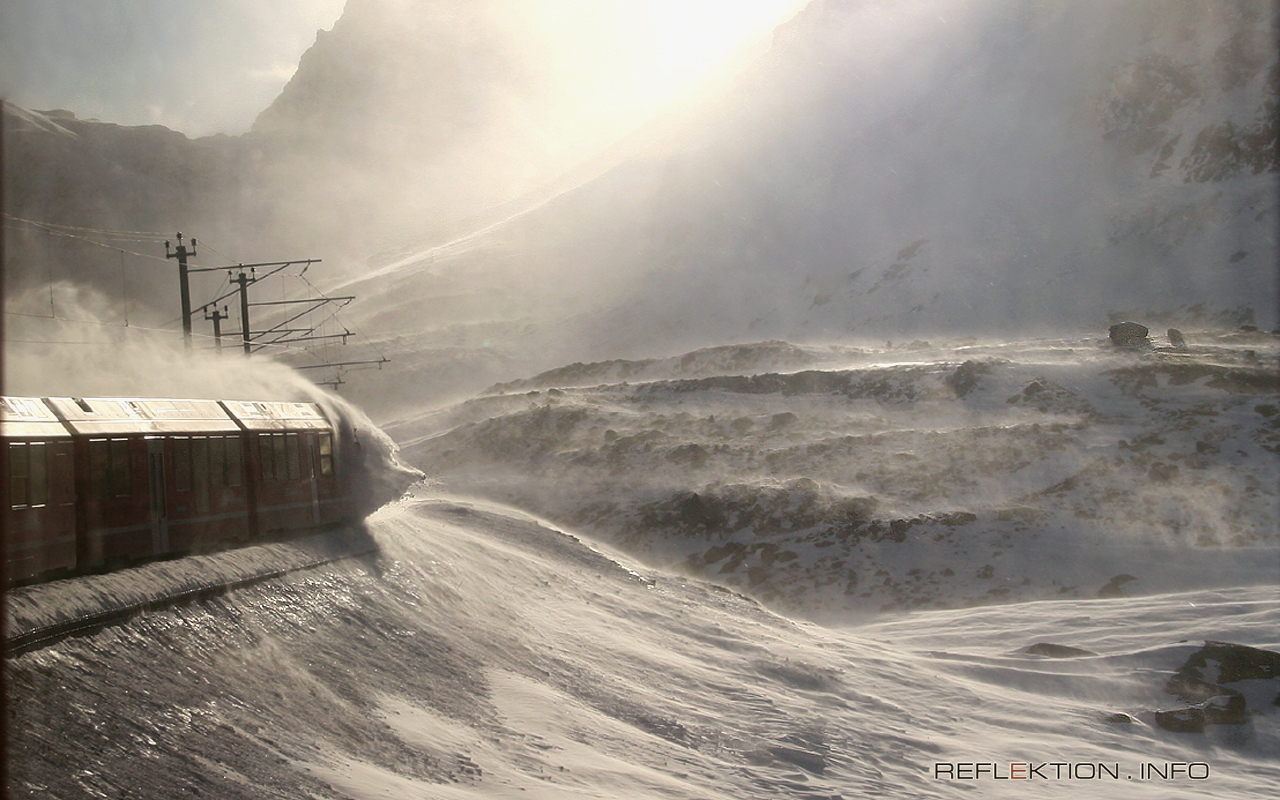 RHÄTISCHE BAHN - BERNINA LINIE - STAZIUN OSPIZIO BERNINA Die Stürme der letzten Tage sorgen auch auf der größtenteils offen durch das Hochgebirge geführten BERNINA BAHN für Schneeverwehungen. Wenn dann der Triebwagen, wie hier der RhB ALLEGRA Ae 8/12 3510, wenig südlich der Passhöhe bei Ospizio Bernina auf rund 2200 Metern üM. durch die Verwehungen stößt, entstehen spektakuläre Ansichten.