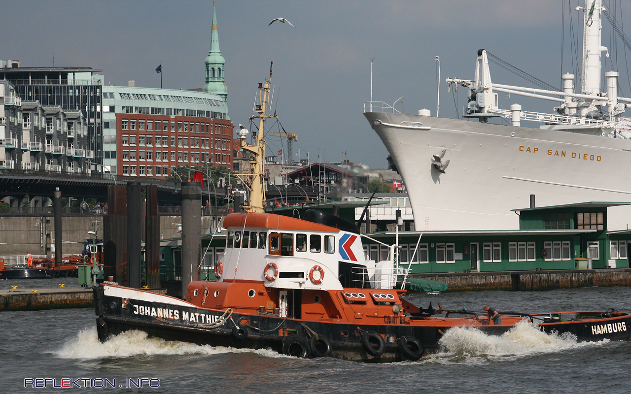 Schlepper JOHANNES MATHIES Der Schepper JOHANNES MATHIES ist 1942 auf der Werft Scheepswerf J. Pattje, in Waterhuizen, Niederlande gebaut worden. Rund 65 Jahre lang war das Schiff bis zur Ausmusterung und Abbruch im Jahre 2008 täglich im Hamburger Hafen unterwegs. Einige Daten: Länge 25,03 Meter, Breite 6,55 Meter, Tiefgang 3,40 Meter Pfahlzug 12 to, Geschwindigkeit 12 kn Tonnage: 111 Tonnen Die Postion des Schiffes am Grünpfeil auf Google-Maps
