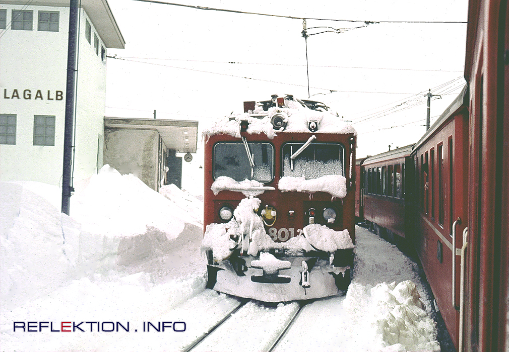 BERNINA BAHN Gem 4/4 801 In der Station LAGALB auf der BERNINA BAHN der RHÄTISCHEN BAHN steht der Schneeräumzug mit der vom harten Einsatz gezeichneten Lok Gem 4/4 801. Diese Maschine ist eine Zweikraftlok, d.h. sie kann wahlweise mit Strom oder Diesel betrieben werden. Dadurch ist die Lok unabhängig vom Fahrdraht und kann somit auch bei Unterbruch der Fahrleitung nach Lawinenniedergängen eingesetzt werden. Die Lage der Station LAGALB...