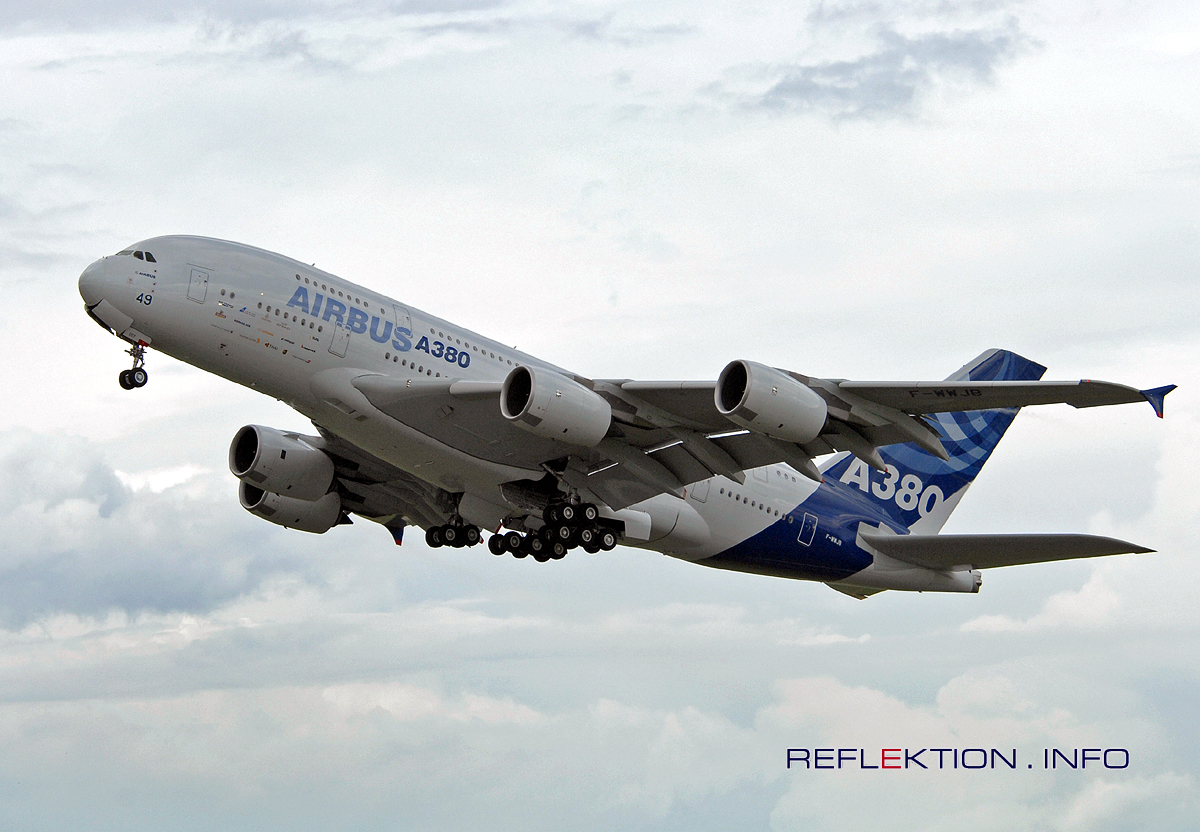 Die A380 mit der Fertigungsnummer 007 und der Zulassung F-WWJB hebt während der Luftfahrtschau in Paris vom Flughafen Le Bourget zu einer Vorführung mit mehreren Platzrunden ab.