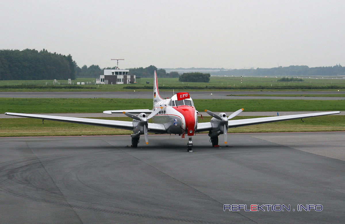 LTU DeHavilland DH 104 DOVE D-INKA 2 400-PS-6-Zylinder-Reihenmotoren treiben die 1944 als sehr modernen Tiefdecker entwickelte DOVE (TAUBE) an. Das zuverlässige und gutmütige Flugzeug in Ganzmetallbauweise besitzt noch stoffbespannte Ruderflächen. Bis zu 14 Passagiere finden in dem nur 12,20 Meter langen Flugzeug Platz. 542 Exemplare sind bis zur Produktionseinstellung im Jahre 1968 hergestellt worden. Die LTU setzte in den ersten Jahren ab der Gründung auch eine DOVE ein. Vor einigen Jahren hat LTU wieder eine Maschine erworben und mustergültig aufgearbeitet. Jetzt kann die Maschine mit dem Kennzeichen D-INKA für Rundflüge gebucht oder auch gechartert werden.
