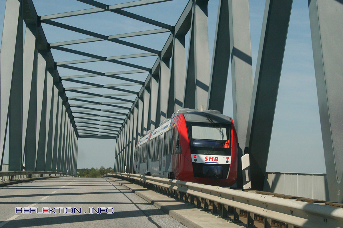 GRÜNENTALER HOCHBRÜCKE Die Hochbrücke ist 420 Meter lang und überspannt in einer lichten Höhe von 42,50 Meter bei Albersdorf in Dithmarschen die weltweit meist befahrene Schiffahrtsstraße, den NORD-OSTSEE-KANAL. Die von 1984-1986 für rund 25 Millionen Euro gebaute Stahlfachbrücke hat 2 Fahrspuren für den Autoverkehr und seitlich davon getrennt eine eingleisige Trasse für den Bahnverkehr sowie einen getrennten Rad- und Fußweg. Die Eisenbahnstrecke von Büsum - Heide - Albersdorf - Neumünster wird mit Triebwagen vom Typ LINT der SCHLESWIG-HOLSTEIN-BAHN (SHB) befahren. Die erste Grünentaler Hochbrücke von 1892 war wesentlich kürzer und zwang den Kanal zu einer Engstelle für den Schiffsverkehr. Zusätzlich verlor die alte 160 Meter weite Bogenbrücke zunehmend an Standsicherheit, so daß der Neubau nötig wurde.