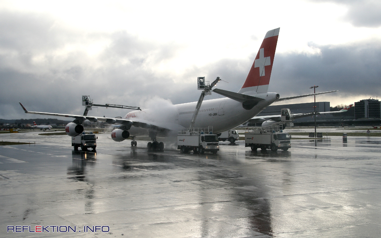 Enteisungssaison - SWISS AIRBUS A 340 HB-JMH Jetzt ist wieder Hochsaison für die Enteisungsfahrzeuge auf den Flughäfen. Gleich 4 dieser Spezialfahrzeuge besprühen die starbereite SWISS A340 HB-JMH auf dem Zürcher Fughafen Kloten.