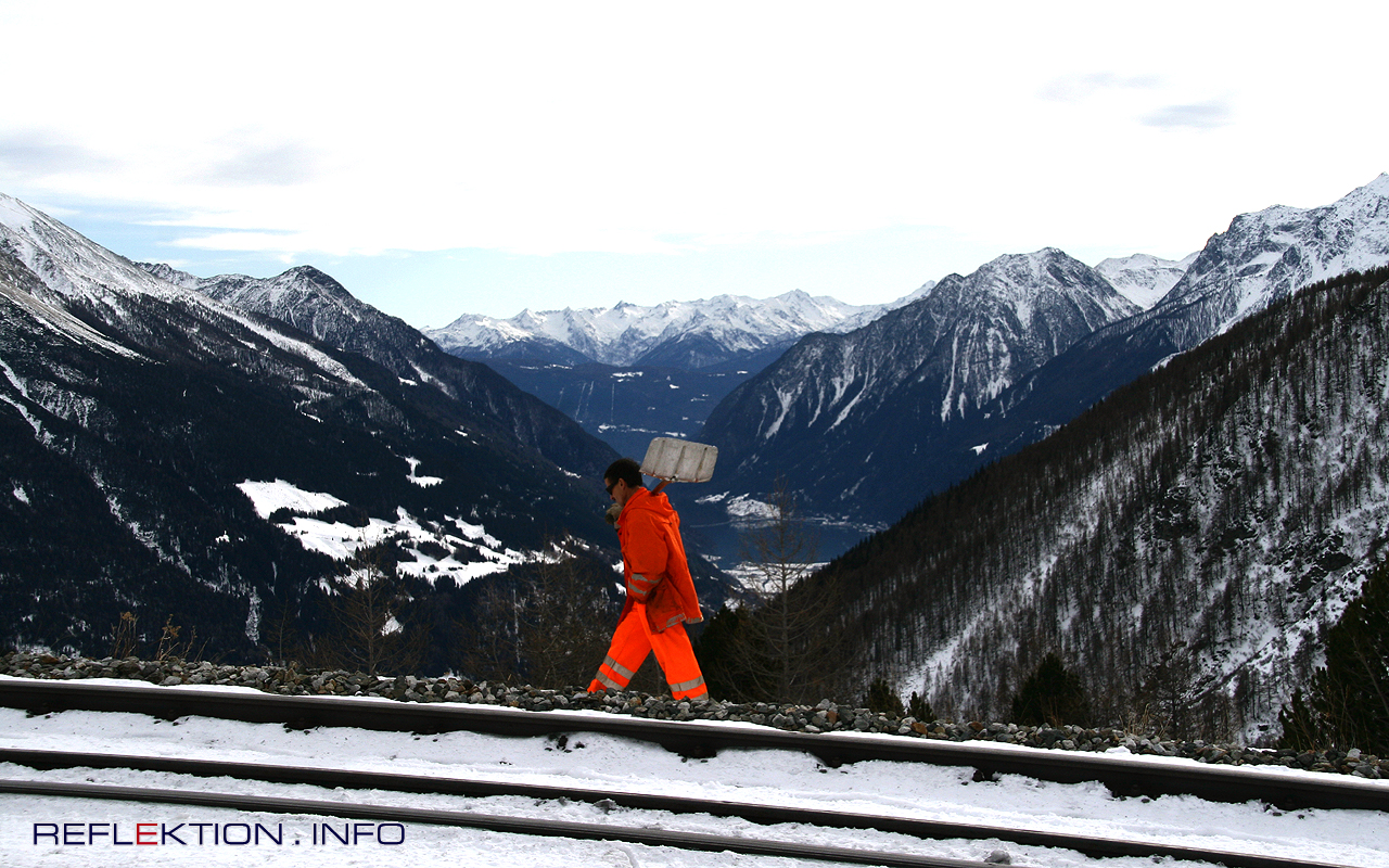 RHÄTISCHE BAHN - BERNINA LINIE - STAZIUN ALP GRÜM Die Stürme der letzten Tage sorgen auch auf der größtenteils offen durch das Hochgebirge geführten BERNINA BAHN für Schneeverwehungen. Trotz dieses Winterwetters bietet sich ein fantastischer Blick vom rund 2100 Meter hohem Aussichtspunkt Alp Grüm nach Süden auf die Bergasmasker Alpen. Diese Schönheiten berühren den Streckenläufer der Rhätischen Bahn nicht mehr. Stoisch sucht er mit der geschulterten Schaufel die Strecke ab und freut sich auf einen Kaffee im Bahnhofsrestaurant, denn die letzte Etappe von der Station Cavaglia, rund 450 Meter tiefer gelegen, nach Alp Grüm herauf ist zumindest bei diesem Wetter ein harter Weg - ganz besonders am Neujahrstag.