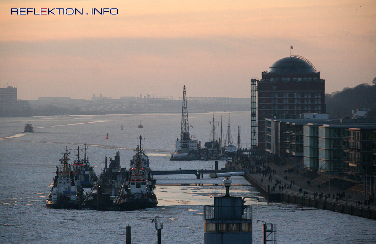 Schlepperbrücke in Oevelgönne Vom St. Pauli Fischmarkt elbabwärts fällt der Blick auf die Schlepperbrücke in Oevelgönne. Hier warten rund 20 große Schlepper auf Assistenzaufgaben für große ein- und auslaufende Schiffe. Noch ein wenig weiter liegen die Schiffe des Museumshafen Oevelgönne zu Füßen des ehemaligen Butter- und Margarinekühlhauses, daß nach einem aufwendigen Umbau zur Seniorenresidenz mit hohem Komfort geworden ist und heute Augustinum heißt. Ganz links am Bildrand, am anderen, südlichen Elbufer steht das heute wieder genutzte hohe Verwaltungsgebäude der ehemaligen Deutschen Werft. Noch etwas weiter elbabwärts sind die weiträumigen Anlagen von Airbus in Finkenwerder zu sehen.