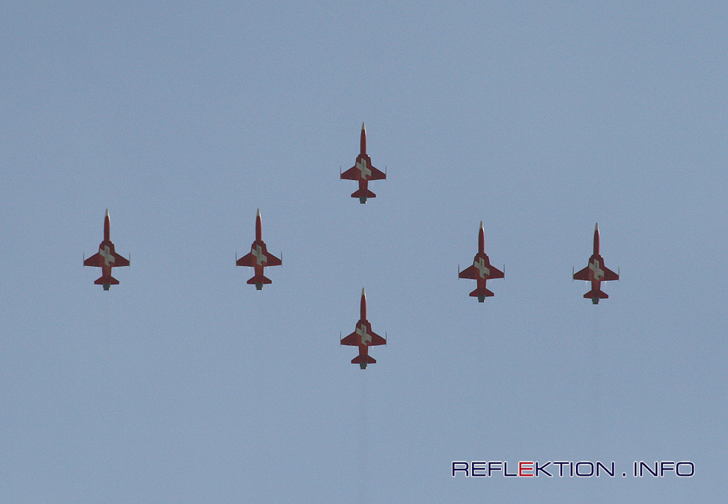 PATROUILLE SUISSE Die Staffel aus 6 Jets des Typs NORTHROP F-5E TIGER II zeigte zum 820. Hamburger Hafengeburtstag einen Großteil ihres aus 21 Figuren bestehenden Kunstflugprogramms - hier die Kreuzformation. Seit nun schon 45 Jahren führt die Kunstflugstaffel der Schweizer Luftwaffe ihre präzisen Formationsflugprogramme in ganz Europa vor. Und zwar absolut unfallfrei, das zeugt von einem großen Können der Piloten und einer sorgfältigen Planung der Flugfiguren. In den letzten Jahren wird die PATROUILLE SUISSE immer öfter zu zivilen Veranstaltungen wie Konzerten der Rolling Stones und Madonna, Eröffnung der Ski-WM und der Fußball-EM eingeladen. Von den geplanten 9 Vorführungen zum Hamburger Hafengeburtstag konnten jedoch nur 3 durchgeführt werden, da von einigen Medien schrille Proteste gegen “Tiefflüge zwischen Hamburgs Dächern” erfolgreich erhoben wurden. Wie leider inzwischen medienüblich zeugten diese Proteste von Panikmache, purer Unkenntnis und bewußter Desinformation.