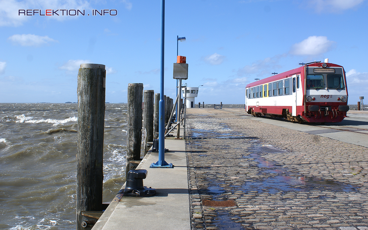NORDDEUTSCHE EISENBAHNGESELLSCHAFT T4 Bei einer kräftigen Sommerbrise mit Windstärke 6 wartet der Dieseltriebwagen T4 auf der Mole im Bahnhof von Dagebüll auf die Fähre aus Amrum und Föhr, um die Reisenden nach Niebüll zu bringen. Kurswagen der DB aus Hamburg werden an den Triebwagen angehängt, so daß das Umsteigen in Niebüll entfällt. Die knapp 14 Kilometer lange Strecke bewältigt der Triebwagen in 20 Minuten.
