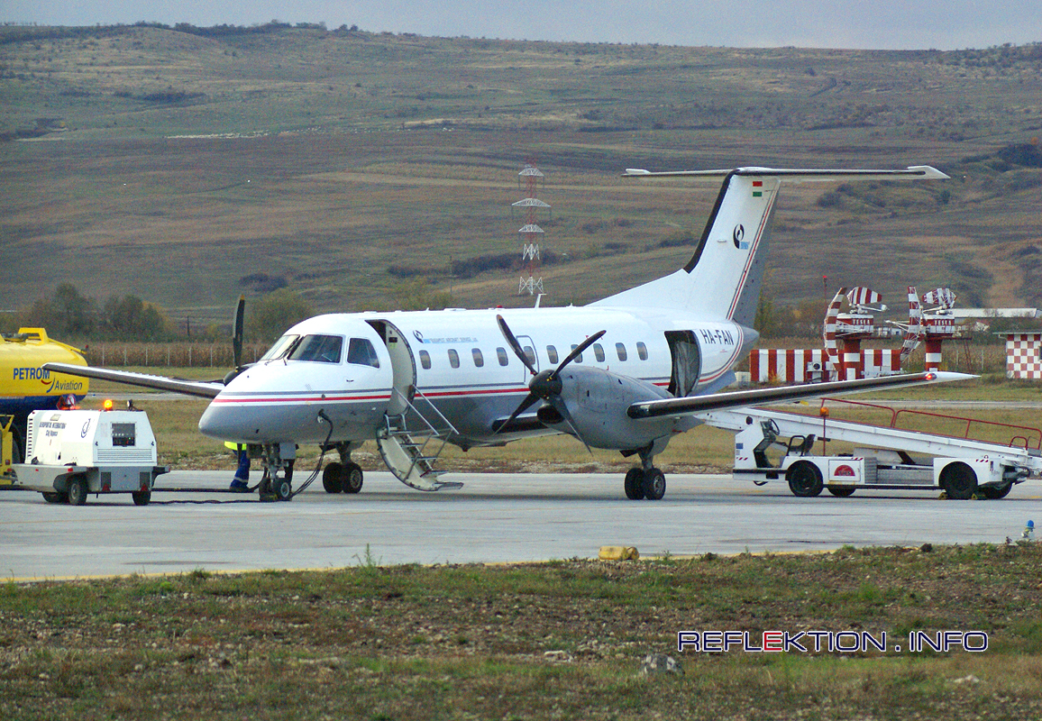 EMBRAER EMB 120ER BRASILIA Über 350 Maschinen der BRASILIA hat der brasilianische Flugzeugkonzern EMBRAER seit 1985 produziert. Die Reichweite der dreißigsitzigen Maschine beträgt rund 2000 km. Damit ist das kleine Flugzeug für den Regionalverkehr bestens geeignet. In 7. Hand ist das abgebildete, 1991 gebaute Flugzeug seit August 2008 bei BUDAPEST AIR SERVICE mit der Kennung HA-FAN in Betrieb. Die Airline betreibt weitere 4 EMB 120 als einzigen Typ in der Flotte.
