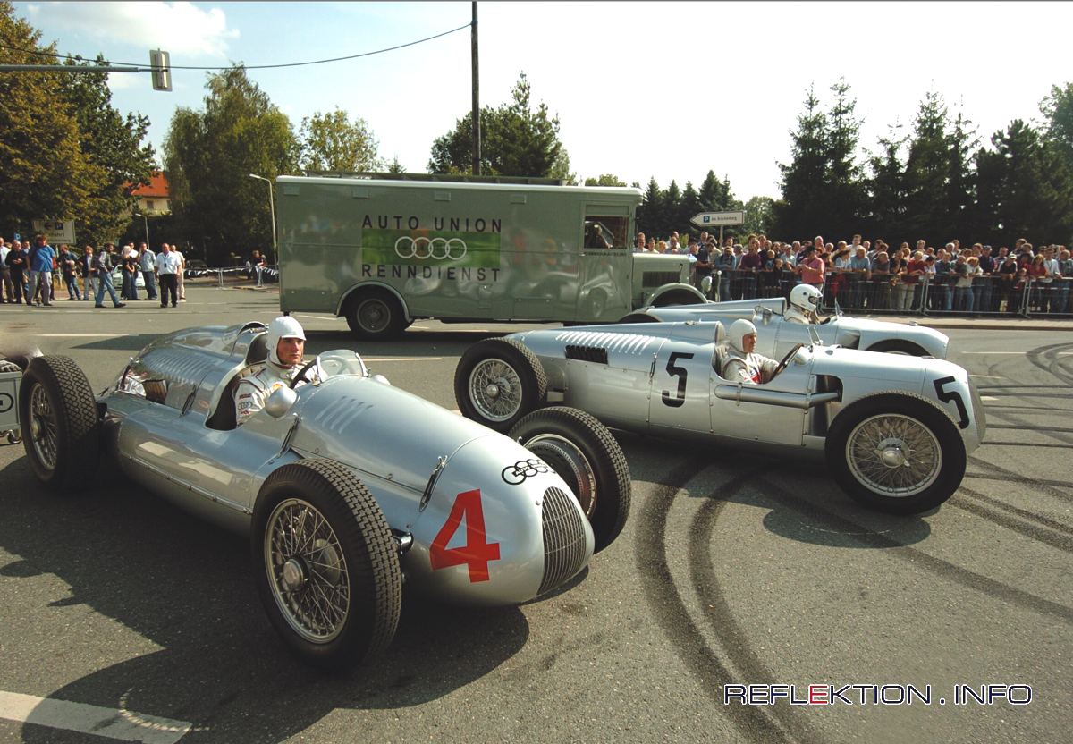 AUDI-Tradition zum Showrennen auf dem Donau Ring sammeln sich hier automobile Berühmtheiten der Dreißiger Jahre des letzten Jahrhunderts (v.l.n.r.): Auto Union Typ D, Baujahr 1938 Auto Union Typ C, Baujahr 1936 Auto Union Typ A, Baujahr 1934. Dahinter parkt der Büssing NAG-Renntransporter Typ 300, Baujahr 1934