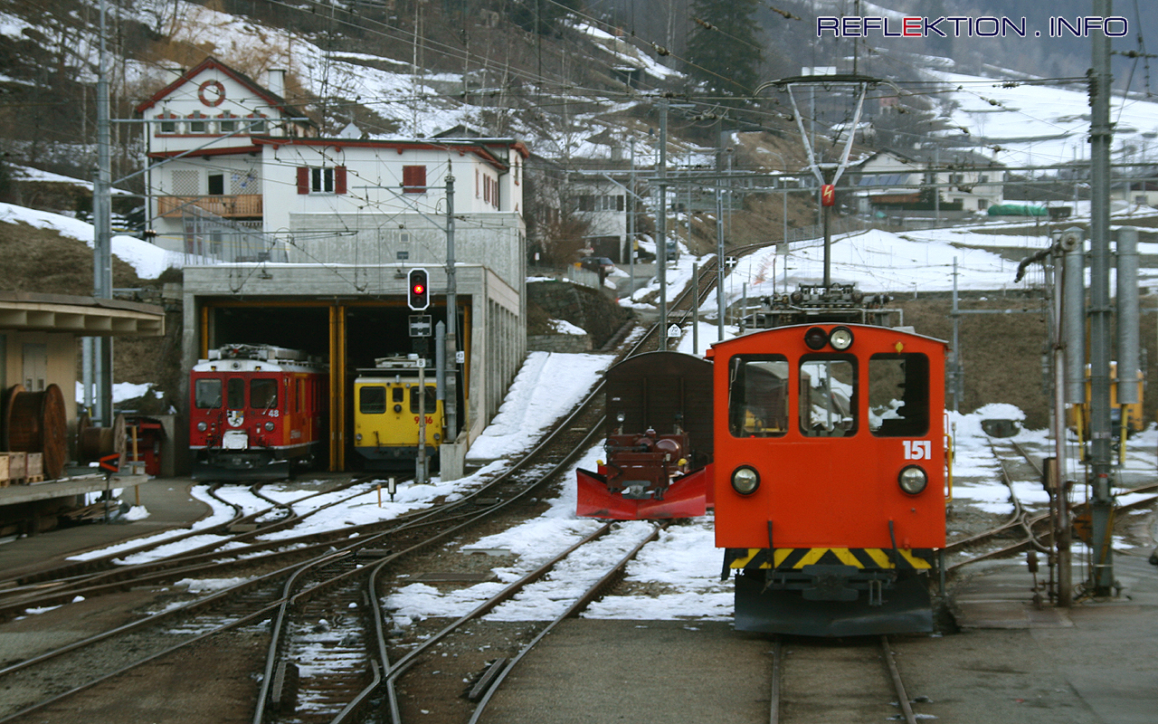 RHÄTISCHE BAHN -BERNINA BAHN- in POSCHIAVO Auf der Südseite der BERNINA BAHN befindet sich in 1000 Meter Höhe der Ort Poschiavo. Mit 3500 Einwohnern ist Poschiavo der Hauptort der Talschaft Puschlav. Im Bahnhof stehen der 102-jährige Triebwagen De 2/2 151, ein Spurpflug, der Oberleitungsmontagewagen 9916 und der Triebwagen ABe 4/4 48 (Bj. 1972)
