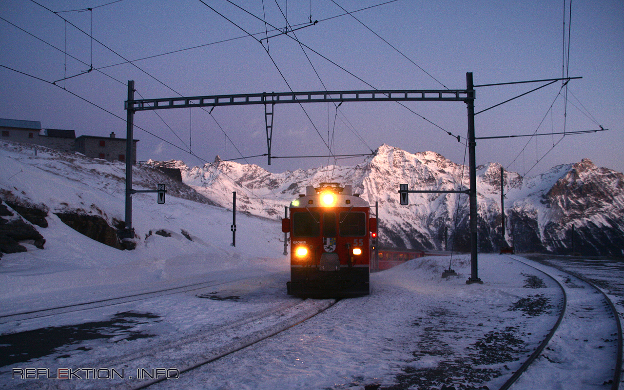 RHÄTISCHE BAHN - BERNINA LINIE - STAZIUN ALP GRÜM Die Sonne geht unter und auf Alp Grüm wird es schnell dunkel. Die gegenüber liegende Bergkette wird noch angestrahlt, als der Zug nach St. Moritz in die Station einfährt.