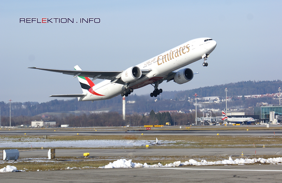EMIRATES BOEING 777-300 A6-EBO Täglich fliegt EMIRATES zweimal mit einer BOEING 777-300 von Zürich nach Dubai. Ab April soll es täglich nur noch einen Flug geben. Möglich macht dies der Einsatz des wesentlich größeren und deutlich leiseren AIRBUS A380. Zürich-Kloten wird dann der 3. Flughafen nach London und Paris in Europa sein, den die A380 planmäßig anfliegt. Ausweichflughafen ist Genf-Cointrin.