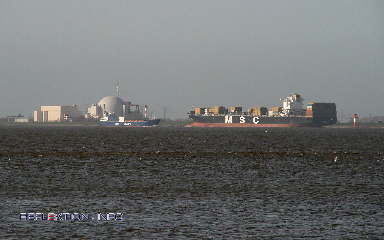 Kernkraftwerk Brokdorf Direkt am Ufer der Unterelbe, zwischen Brunsbüttel und Glückstadt, ist das AKW situiert. Der Kühlwasseraustausch mit der Elbe wird auf kurzen Wegen vollzogen. Alle Stoffe, die hier zirkulieren, werden stets und streng kontrolliert. So gibt es keine Unregelmäßigkeiten, und wenn doch, sind diese stets für alle und für Flora und Fauna sowieso ungefährlich und unbedenklich. Für eine noch bessere Zirkulation sorgen alle Schiffe von und nach Hamburg - sie passieren das AKW in nur rund 300 Metern Entfernung. Betreiber sind zu 4/5 EON und zu 1/5 Vattenfall. Das Kraftwerk arbeitet seit 25 Jahren. Von den 3 AKW in der Umgebung Hamburgs ist Brokdorf als einziges am Netz. Die Abschaltung ist für 2033 vorgesehen. Völlig unabhängig von Empfehlungen einer Ethik-Kommission. Einen guten Blick auf das AKW haben der Containerfeeder LYS LYSBRIS (129 Meter Länge) auf dem Weg nach Hamburg und der Containerfrachter MSC CHARLESTON (323 Meter Länge) mit Zielen in Nordamerika.