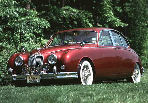 JAGUAR Mk II 3,8 Litre Von 1960 bis 1967 bot JAGUAR den Mk II auch mit einem 6-Zylinder-3,8-Liter-Motor an. Das abgebildete Fahrzeug, Modell 1960, trägt schon den damals noch sehr seltenen Metalliclack, dazu Weißwandreifen, Drahtspeichenfelgen und grünes Colorglas. Diverse Club-Embleme zieren die Stoßstange des in New Jersey zugelassenen JAGUAR Technische Daten: Länge 4,59 m; Breite 1,69 m; Höhe 1,43m; Radstand 2,73 m; Leergewicht 1448 kg 6 Zylinder; 12 Ventile; DOHC; 3781 ccm; 220 PS bei 5500 U/min; 325 Nm bei 3000 U/min; Höchstgeschwindigkeit 201 km/h (125 mph); 0-100 km/h 8,5 Sekunden; Durchschnittsverbrauch 16 Liter; Tankinhalt 55 Liter