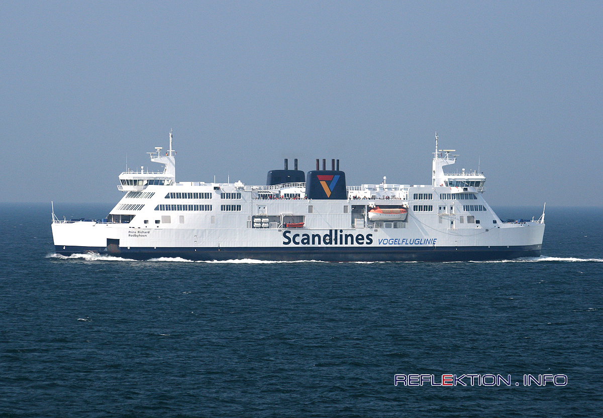 Fährschiff PRINS RICHARD Mehrmals pro Stunde verbindet die Reederei SCANDLINES auf der Vogelfluglinie in 45 Minuten mit 5 nahezu typgleichen Fährschiffen Puttgarden und Rodby Havn in Dänemark. Daten der PRINS RICHARD: Indienststellung: 1997, Heimathafen: Rødby Havn Passagiere: 900 Länge: 142,0 m, Breite: 25,4 m, BRZ: 14.621 Geschwindigkeit: 18,5 kn Gleislänge: 117,6 m Kapazität: 620 Lanemeter Besatzung: 12 Nautik / Technik ; 13 Servicepersonal