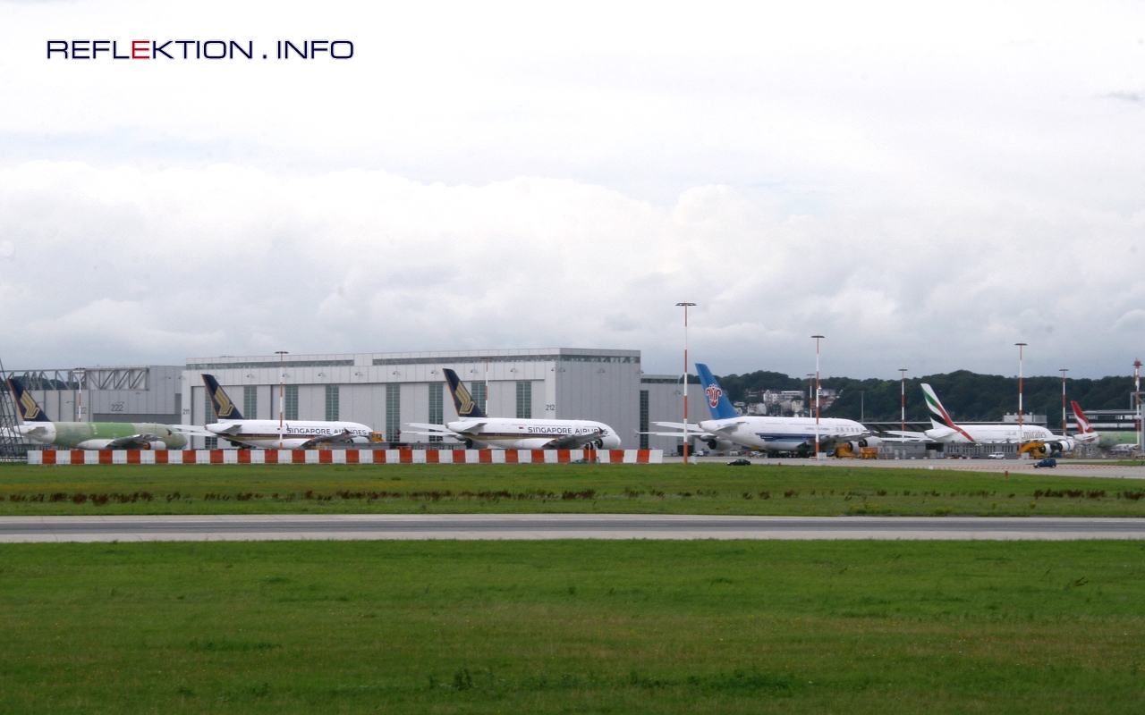 6 Riesen gleich 6 Maschinen vom Typ AIRBUS A380-800 stehen zur Endmontage im Freigelände des AIRBUS-Werkes in Hamburg-Finkenwerder. Von links nach rechts: 3x SINGAPOE AIRLINES, CHINA SOUTHERN, EMIRATES und QANTAS. Alle 6 werden dieses Jahr noch abgeliefert werden.