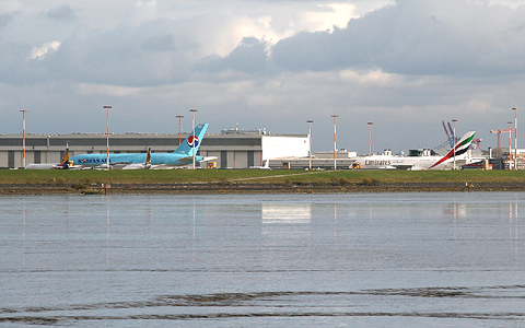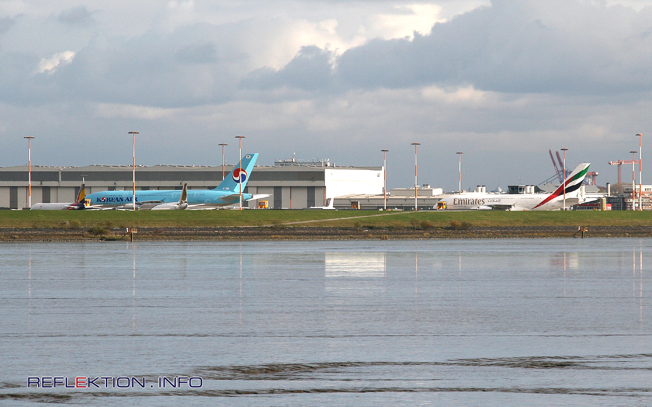 Vom Schiffsanleger am Südufer der Elbe im niedersächsischen Cranz ist ein guter Blick auf das rund 1500 Meter entfernte AIRBUS-Gelände möglich. Kurz vor der Auslieferung stehen die A380-861, Emirates Airlines, F-WWSN, A6-EEB (MSN 109) und A380-861, Korean Airlines, F-WWAP, HL7619 (MSN 96); und zu erkennen stehen noch 2 A321-231 vor der Korean-Maschine: A321-231, Asiana Airlines, D-AVZC, HL8266 (MSN 5350) A321-231, Gulf Air, D-AZAS, A9C-CE (MSN 5321) Fotostandort auf Google-Maps