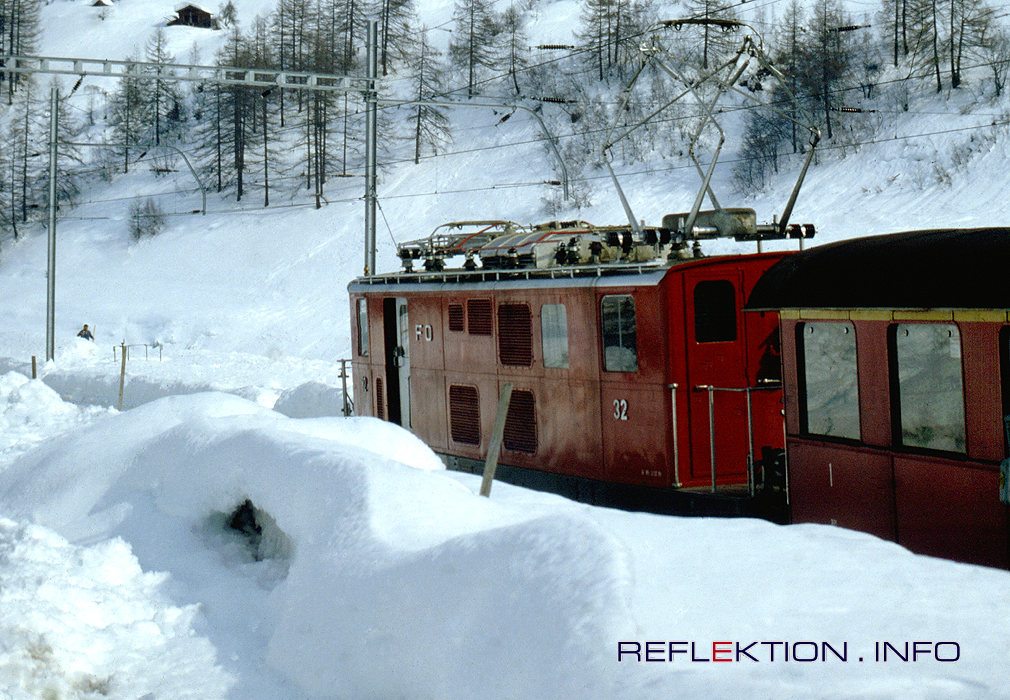 FURKA-OBERALP BAHN Vor 20 Jahren:FURKA-OBERALP BAHN (heute: MGB - MATTERHORN - GOTTHARD BAHN) Der Regionalzug Brig - Oberwald mit der Zuglok HGe 4/4 32 wartet in der Station Biel (Goms) im schweizerischen Kanton Wallis den Gegenzug ab. Erst nach dessen Ankunft ist die Weiterfahrt nach Oberwald auf der eingleisigen Strecke möglich.
