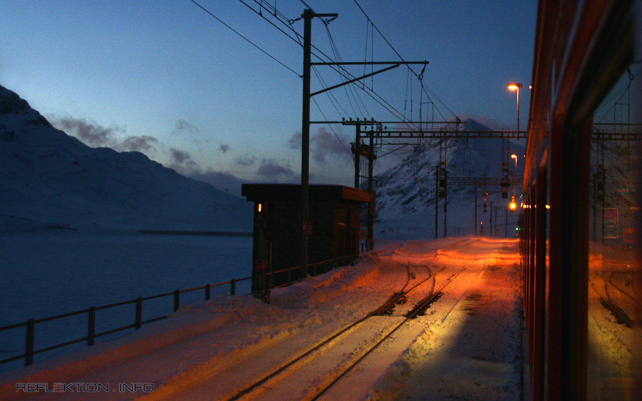 RHÄTISCHE BAHN - BERNINA LINIE - STAZIUN OSPIZIO BERNINA Auf 2253 Meter ü.M., der Passhöhe des Berninapasses an der Station OSPZIO BERNINA bewirken die Lichter des Zuges und das des vom Sturm freigeblasenen Himmels beeindruckende Farbkompositionen. Einige wenige Wolken steigen als graue Tupfer noch von der Bergkette am Ufer des vereisten Lago Bianco auf.