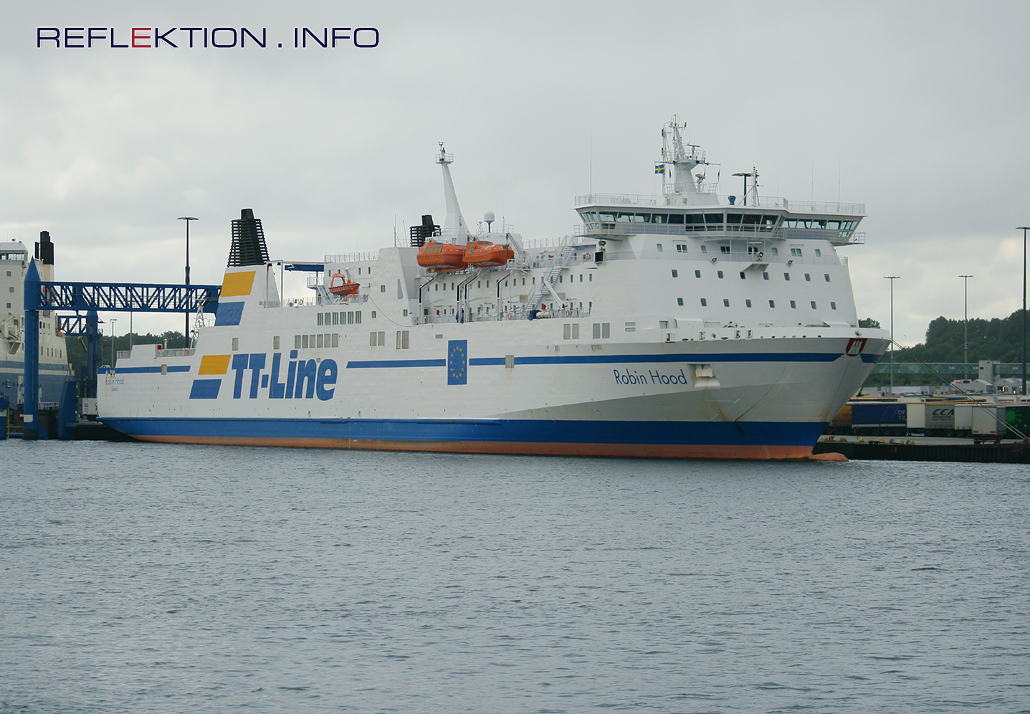 Ostseefähre ROBIN HOOD der TT-LINE Die 1995 in Dienst gestellte Ro-Ro-Fähre und ihr Schwesterschiff NILS DACKE zwischen pendeln zwischen Travemünde und Trelleborg. Sie verfügen über jeweils 2.400 Lademeter (160 Trailer). Alle 3 Ladedecks mit 7 Spuren können direkt ohne Rangieren angefahren werden. 7 Stunden bei Tages- und 7½ bis 9½ Stunden bei Nachtfahrt dauert die Überfahrt.
