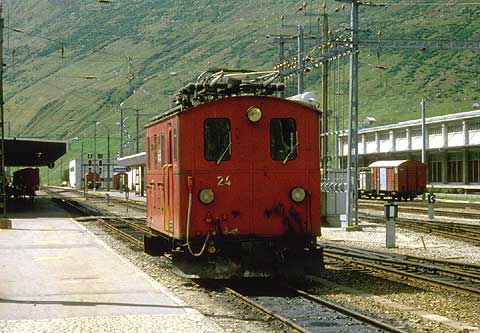 FURKA OBERALP-BAHN HGe 2/2 24 Von 1916 bis 1983 standen die kleinen Zahnrad-Elektroloks der Reihe HGe 2/2 21 - 24 im Dienst bei der FURKA OBERALP-BAHN, bzw. bis 1941 bei der Schöllenen Bahn. Im Zuge der Erneuerung des Fuhrparks der FURKA OBERALP-BAHN wurde die letzte HGe 2/2 1984 verschrottet. Technische Daten: Länge 6,32 m; Breite 2,70 m; Höhe 3,28 Hersteller SLM und BBC 2 Motoren mit 580 PS; Gewicht 25,1 t; Höchstgeschwindigkeit 30 km/h - auf Zahnstangenstrecken 20 km/h
