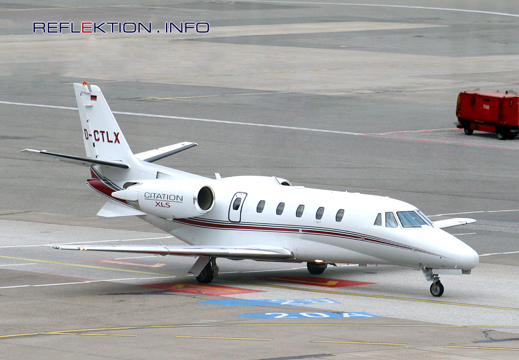 CESSNA CITATION 560XLS EXCEL D-CTLX der Fluggesellschaft HAPAG LLOYD EXECUTIVE. HAPAG LLOYD EXECUTIVE ist eine Airline mit dem Schwerpunkt Geschäftsreise-Charter. Die Flugbasis ist Hannover. Zum Kundenkreis gehören internationale Führungskräfte aus der Wirtschaft, dem Sport, dem öffentlich politischen Leben sowie Persönlichkeiten aus der Reise- und Unterhaltungsbranche. Die 560 XLS hat bei einer Reisegschwidigkeit von 800 km/h eine Reichweite von 3.900 km und erreicht so jede europäische Metropole im Nonstop. Eine geräumige Kabine, für acht Passagiere ausgelegt, luxuriöse Ausstattung, Klimaanlage und Toilette bieten höchsten Komfort während der Reise.