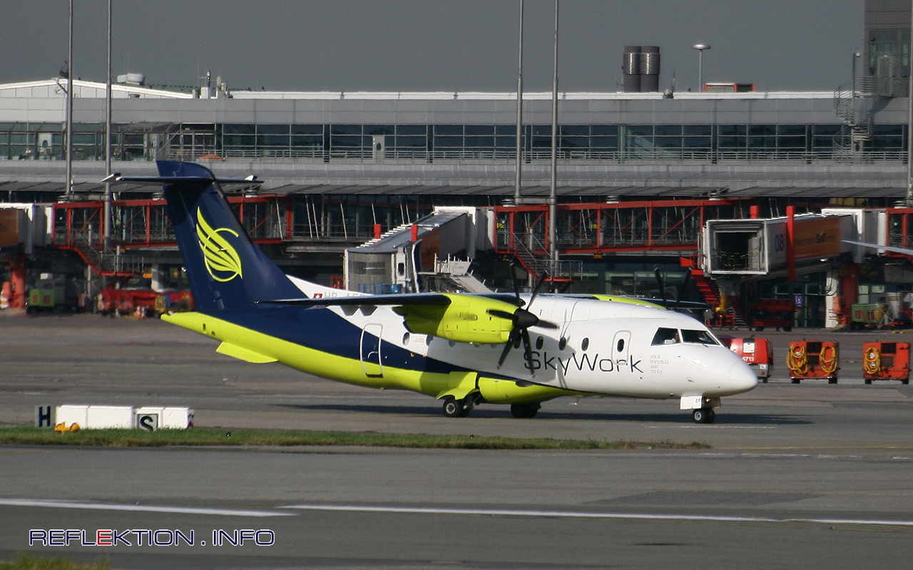 SKYWORK AIRLINES DORNIER Do-328-100 Prop HB-AER Zweimal täglich fliegt die im schweizerischen Bern beheimatete SKY WORK AIRLINES die Route Bern - Hamburg - Bern. Meist wird dabei eine von 5 in der SKY WORK-Flotte fliegenden DORNIER Do-328-100 Prop eingesetzt. Die Do-328 nimmt bis zu 31 Passagiere auf, fliegt non stop maximal 2.500 km weit mit einer Höchstgeschwindigkeit von 620 km/h. Die DORNIER Do-328 als Jet