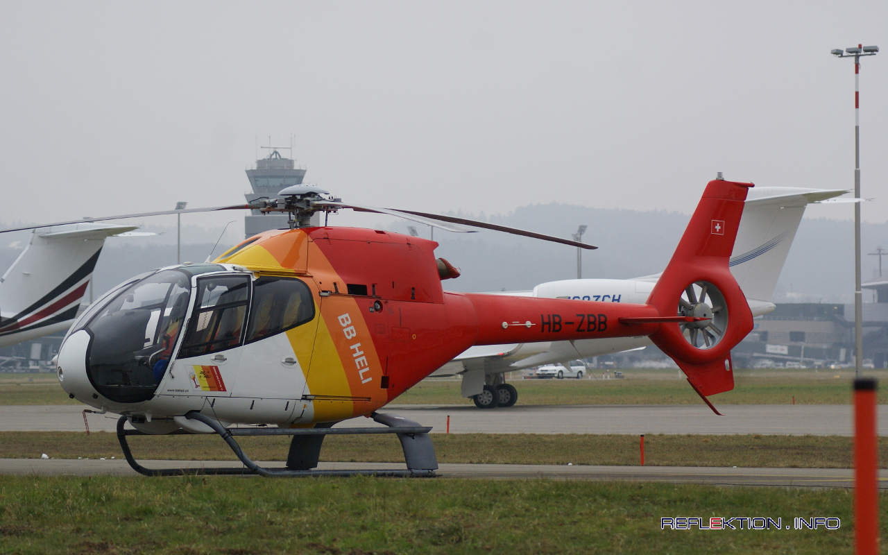 BB-HELI EUROCOPTER EC120B HB-ZBB BB-HELI bietet vom Flughafen Zürich-Kloten mit einer Flotte von 2 EUROCOPTER EC120B und 1 AGUSTA-BELL 206B Rundflüge, Taxiflüge, Hochzeitsflüge und Film/Fotoflüge für bis zu 4 Passagiere an. Die EC 120B ist mit einem Triebwerk Turbomeca Arrius 2F (510 PS) ausgerüstet und fliegt mit einer Reisegeschwindigkeit von rund 220 km/h. Die EC 120 (Rumpflänge: 9,60 m, Rotordurchmesser: 10,00 m) ist mit einem Maximalstartgewicht von 1,8 Tonnen das kleinste und leichteste Modell aus der Hubschrauber-Familie der EADS-Tochter Eurocopter.