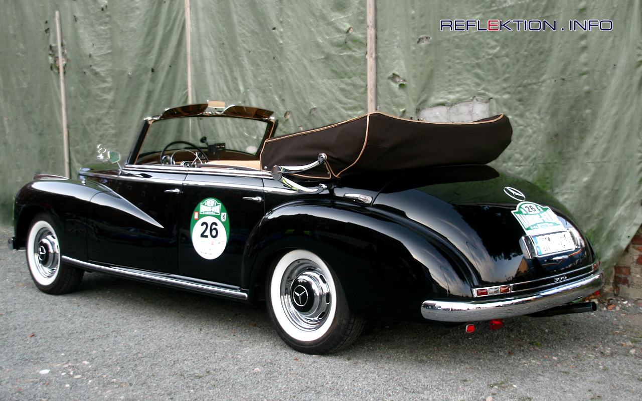 MERCEDES-BENZ 300, 1953 Nur 465 dieser 300-Cabrios fertigte Mercedes-Benz zwischen 1951 und 1954. Der Motor leistet aus 6 Zylindern in Reihe 115 PS. Die Höchstgeschwindigkeit betrug im Jahre 1953 erstaunliche 160 Kilometer in der Stunde. Bis zum Erscheinen des Porsche 356 1500S war der 300 der schnellste deutsche Serienwagen. In verschiedenen modifizierten Formen wurde der 300 bis 1962 produziert. Die Limousine ist als Adenauer-Mercedes bekannt. Die Weiterentwicklung des Motors führte zu einer Leistungssteigerung auf 215 PS und zum Einbau in den legendären 300 SL Flügeltürer und später in den 300 SL Roadster.