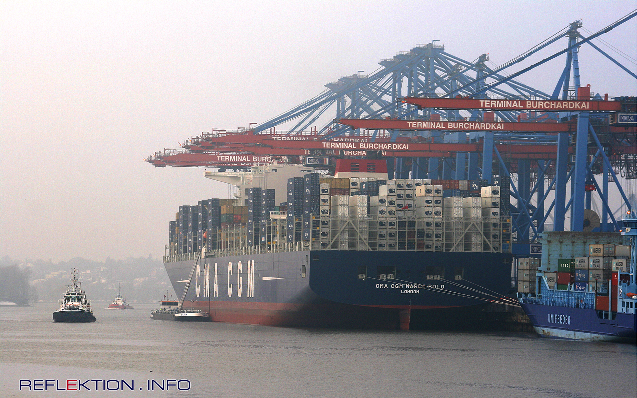 CMA CGM MARCO POLO Mit dem Hochwasser ist in der Nacht zum Mittwoch das größte Containerschiff der Welt in den Hamburger Hafen eingelaufen. Die CMA CGM MARCO POLO erreichte auf ihrer Jungfernfahrt in der Nacht zum 12.12.12 erstmalig Hamburg und lief mit der Hochwasserwelle in den Hafen ein. Der am 5. November 2012 in Dienst gestellte Containerfrachter ist 396 Meter lang und 54 Meter breit und liegt vollbeladen mit 16.020 20-Fuß-Container bzw. 186470 Tonnen Zuladung maximal 16 Meter tief im Wasser. Für gut 20 Stunden hat die MARCO POLO am Containerterminal Burchardkai im Waltershofer Hafen festgemacht. In dieser Zeit werden rund 4.000 Container umgeschlagen. Das Schiff wird im Liniendienst FAL 1 der französischen Reederei CMA CGM zwischen Europa und Asien fahren und künftig regelmäßig den Hamburger Hafen anlaufen. Die dabei angelaufenen Häfen sind Ningbo, Shanghai, Xiamen, Hong Kong, Chiwan, Yantian, Port Kelang, Tanger, Southampton, Hamburg, Bremerhaven, Rotterdam, Zeebrugge, Le Havre, Malta, Khor Al Fakkan und Jebel Ali. Der Umlauf dauert 77 Tage und wird einmal wöchentlich bedient. 2013 werden 2 zur Zeit im Bau befindliche Schwesterschiffe ebenfalls in diesem Liniendienst eingesetzt werden. Zum Vergleich: der winzig wirkende, hinter der MARCO POLO liegende Containerfrachter AURORA ist 135 Meter lang und 23 Meter breit. Beileibe kein kleines Schiff.