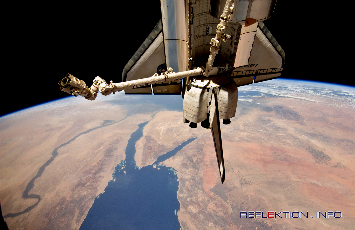 SPACE SHUTTLE DISCOVERY STS-131 Nur noch 3 Flüge wird die NASA mit den Space Shuttle durchführen. Dann werden die betagten Raumfähren außer Dienst gestellt werden. Bei der laufenden Mission STS-131 transportiert die DISCOVERY Lebensmittel und weitere Ausrüstung zur Internationalen Raumstation (ISS). Die DISCOVERY war am 5. April 2010 gestartet und hat 2 Tage später an der ISS angedockt. Das Foto entstand in 215 Meilen Höhe über dem Nahen Osten. In Bildmitte die Sinai-Halbinsel und das Rote Meer. Links davon das dunkle Band des Nil und rechts unter dem Space Shuttle Saudi Arabien und der Irak. Während der knapp zweiwöchigen Reise sind 3 Außeneinsätze an der ISS geplant. Die Rückkehr der DISCOVERY ist für den 19. April um 15:54 Uhr MESZ geplant.