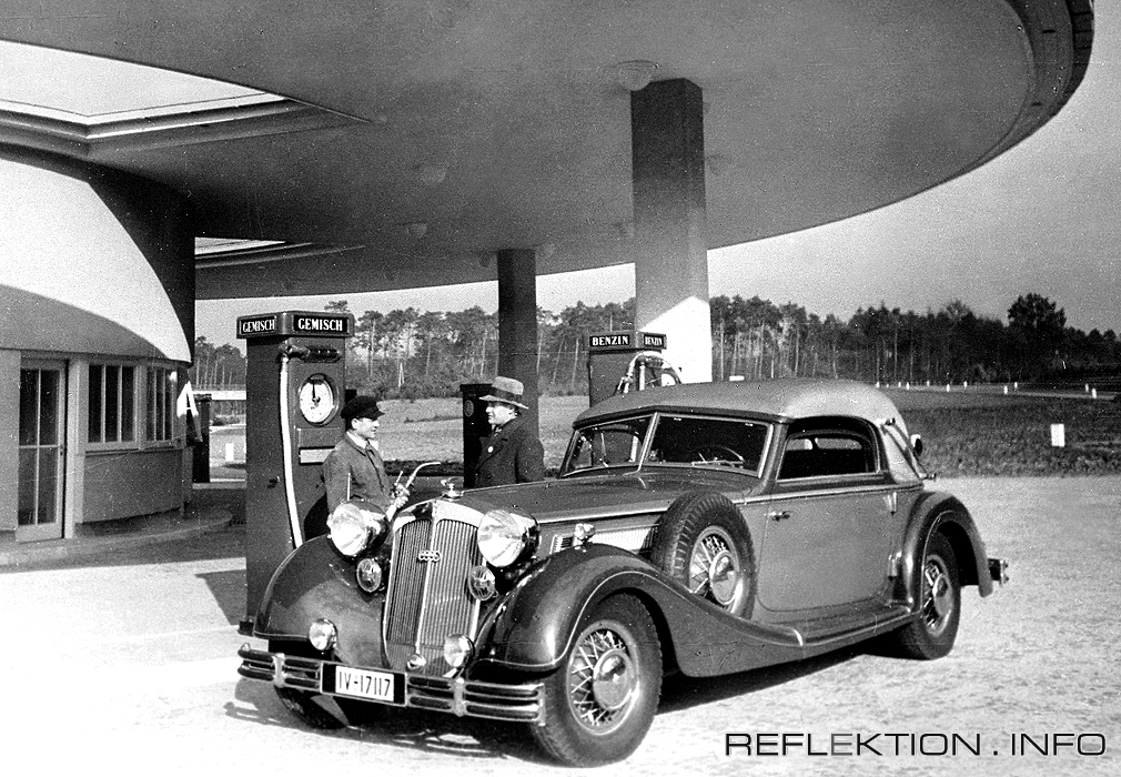 HORCH 853 Bis zu 125 Liter tankt das Oberklasse-Cabrio an der Reichsautobahn-Tankstelle. Einige Daten zum HORCH 853: Länge 5,35 Meter, Breite 1,83 Meter, Höhe 1,58 Meter, Radstand 3,45 Meter, Wendekreis 14,60 Meter 8-Zylinder-Reihenmotor, 4946 ccm, 120 PS bei 3200 U/min, Höchstgeschwindigkeit rund 140 km/h, Verbrauch 20 - 30 Liter Leergewicht 2600 kg, maximale Zuladung 350 kg