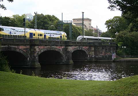 Zwischen dem Hamburger Hauptbahnhof und dem Bahnhof Dammtor begegnen sich der METRONOM und ein ICE 3 der DB auf der mehr als 140 Jahre alten Lombarsbrücke.