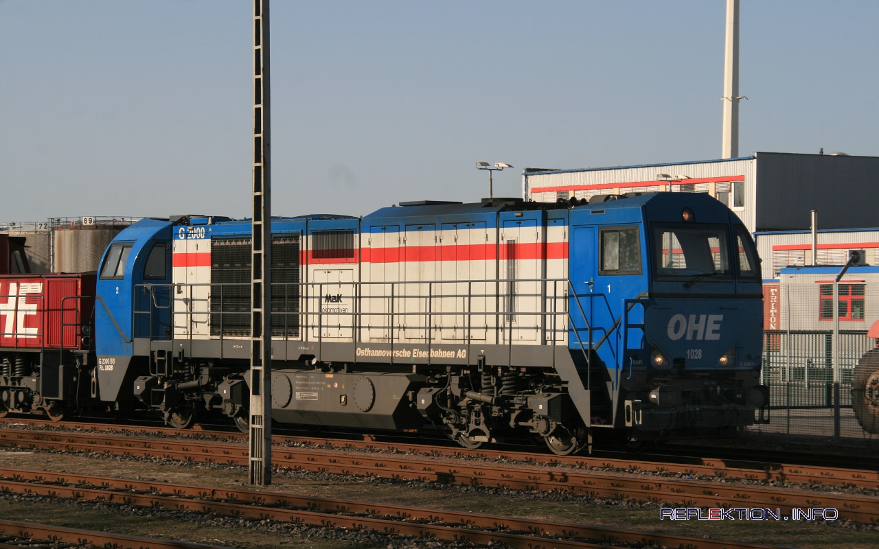 OSTHANNOVERSCHE EISENBAHNEN - Diesellok VOSSLOH G2000 100 1028 Vossloh Schienenfahrzeugtechnik GmbH (VSFT) lieferte die G 2000 BB am 15.6.2001 an LC-Locomotion Capital (seit 2003 Angel Trains Cargo), London aus. Von dort wird die Lok vermietet. 17 Stationen quer durch Deutschland hatte die 1001-033 hinter sich, als sie im Januar 2007 zu den Osthannoverschen Eisenbahnen AG (OHE) in Celle kam. Die Maschine mit den gewöhnungsbedürftigen asymmetrischen Führerständen wird von den OHE auch im Containerverkehr im Hamburger Hafen eingesetzt. Der Catarpillar-Dieselmotor leistet 2240 kw. Die 17,4 Meter lange, vierachsige Lok hat ein Dienstgewicht von 87,3 Tonnen. Die Höchstgeschwindigkeit liegt bei 120 km/h. 20 Maschinen dieses Typs hat Vossloh bis 2003 gebaut. Weitere 48 Loks wurden bisher mit symmetrischen Führerhäusern hergestellt.