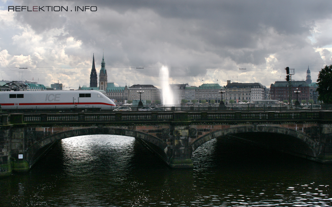 LOMBARDSBRÜCKE Die kombinierte Eisenbahn- und Straßenbrücke trennt die Außen- und Binnenalster. 4 Gleise - 2 für die S-Bahn und 2 für Personen- und Güterzüge - und 5 Kfz-Spuren nebst breiten Rad- und beidseitigen Fußwegen finden auf der 69 Meter langen und fast 50 Meter breiten Brücke Platz. Die Brücke wurde bereits 1865 erbaut und lediglich 1902 um 17 Meter verbreitert. Von hier blickt man gen Süden zwischen den charakteristischen, vierarmigen Kandelabern auf die Alsterfontäne und den rund 600 Meter entfernten Jungfernstieg. Überragt wird diese Szene vom Turm der Nikolaikirche, dem des Rathauses und ganz rechts dem der St. Michaeliskirche. Fotostandort am Grünpfeil auf Google-Maps