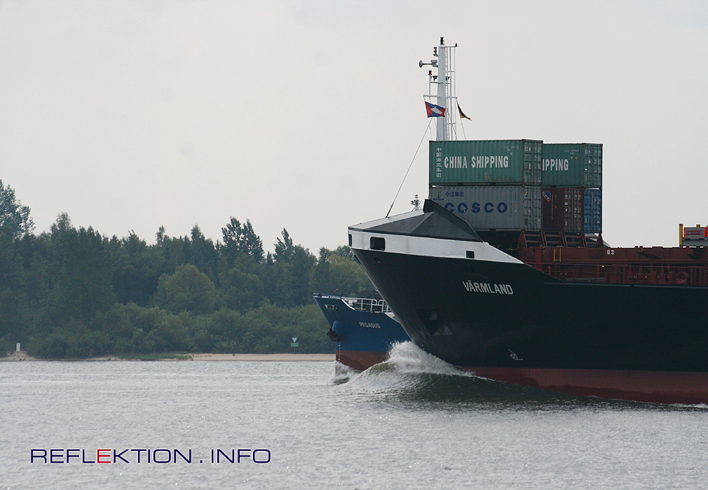 mit deutlichem Geschwindigkeitsüberschuß und kräftiger Bugwelle elbaufwärts fahrend überholt der Containerfeeder VÄRMLAND der Reederei TEAM LINES das kleinere Tankschiff PAGASUS .