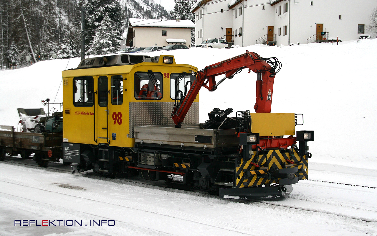 RHÄTISCHE BAHN Tm 2/2 98 Für den Baudienst benötigte die RHÄTISCHE BAHN eine Reihe neuer Traktoren, in die die über die Jahre gesammelten Erfahrungen einfließen sollten. Robert Aebi wurde wie bereits bei den ersten Tm 2/2 von 1957-1969 beauftragt, 4 neue Fahrzeuge (Tm 2/2 81-84) zu bauen. Ein geräumiges Führerhaus für Aufnahme und Transport des Bautrupps, eine große, kippbare Ladefläche mit 4 t Tragfähigkeit und ein hydraulischer Ladekran gehören zum Standard. Der Cummins-Dieselmotor leistet 336 kW und ermöglicht eine Geschwindigkeit bis zu 60 km/h. 1998 wurden weitere Traktoren dieser Bauart benötigt. Außerdem war Tm 2/2 82 nach einem Unfall verschrottet worden, so daß noch einmal 4 weitgehend baugleiche Traktoren (Tm 2/2 95-98) gebaut worden sind - diesmal allerdings nicht mehr bei Robert Aebi in der Schweiz, sondern bei Windhoff in Deutschland.