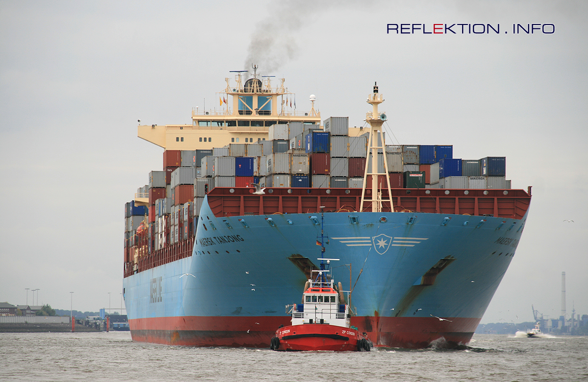 MAERSK TANJONG 333 Meter lang, 43,20 Meter breit, maximal 20,20 Meter Tiefgang, Fassungsvermögen 8230 20-Fuß-Container, 95.000 Tonnen BRZ - das sind die Eckdaten des Containerfrachters MAERSK TONJANG, der hier mit Assistenz der KOTUG-Schlepper ZOE und CONDON (gerade noch sichtbar am Bug) an seinen Liegeplatz am EUROKAI-Containerterminal im Hambuger Hafen bugsiert wird.
