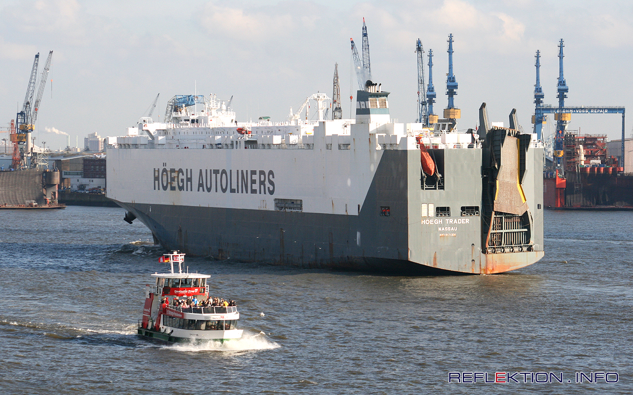 HÖEGH TRADER Der CaCa-Frachter (Car Carrier) läuft in den Hamburger Hafen ein. Hier werden rund 4.500 gebrauchte PKW geladen und nach Aqaba in Jordanien verschifft. Die Reederei Höegh Autoliners fährt für viele Autohersteller die Neuwagen über die Weltmeere. Zusätzlich werden auch Gebrauchtwagen transportiert. Einige Daten zur HÖEGH TRADER: CaCa-Frachter Heimathafen Nassau, Bahamas Eigner: HÖEGH Fleet Services AS, Oslo Reederei: HÖEGH Fleet Services AS, Oslo Bauwerft: Daewoo Heavy Industries Ltd., 1998 Länge 229 Meter, Breite 32 Meter, Tiefgang 9,50 Meter Geschwindigkeit 20 Knoten (39 km/h) Bruttoregistertonnen: 68060, Tragfahigkeit: 27100 t Frachtkapazität 7850 CEU Werft: Daewoo Shipbuilding & Marine Engineering, Goeje, South Korea