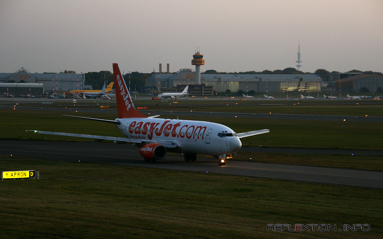 EASY JET BOEING 737-700NextGeneration G-EZKG Im letzten Tageslicht startet die gerade 5 Jahre alte BOEING 737-700NG in Hamburg nach Stansted (rund 60 Kilometer nordnordwestlich von London). 1 Jahr später wird die G-EZKG als weltweit erste 737-700NG außer Dienst gestellt und ein weiteres Jahr auf dem kleinen Flugplatz Kemble bei Gloucestershire abgestellt. Mitte 2011 wurde sie nach Angabe von EASY JET aus wirtschaftlichen Gründen zerlegt. Plausibel erscheint die Begründung allerdings nicht. Mittlerweile hat EASY JET alle BOEING-Maschinen abgegeben und setzt ausschließlich AIRBUS A319 (145 Stück) und A320 (48 Stück) ein.