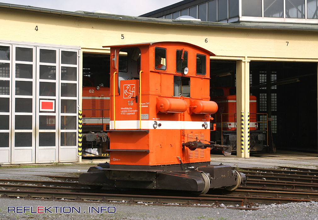 BREUER-Rangiertraktor WLE 16 Preiswert in Anschaffung und Unterhalt, einfache Handhabung, raumsparend - wegen dieser Attribute waren die BREUER-Rangiertraktoren recht verbreitet. Zwischen den Zwanziger und Fünfziger Jahren des 20. Jahrhunderts wurden rund 1100 Stück gebaut, von denen manche wie WLE 16 bis heute überlebt haben. Das Prinzip war einfach. Auf den kleinen Plattformen zwischen den Achsen befand sich eine Hubspindel, mit der der zu rangierende Wagen angehoben wurde. Durch das nun größere Reibungsgewicht konnten auch größere Lasten rangiert werden, wie es sonst nur mit einer deutlich größeren Rangierlok möglich wäre. Der Traktor Nr. 16 der WESTFÄLISCHEN LANDESEISEN-BAHN wurde bei Breuer in Höchst 1954 unter der Fabrik-Nr. 3082 gebaut und liefert 55 Kw aus seinem Dieselmotor über Ketten an beide Achsen. Mehr zur WLE...