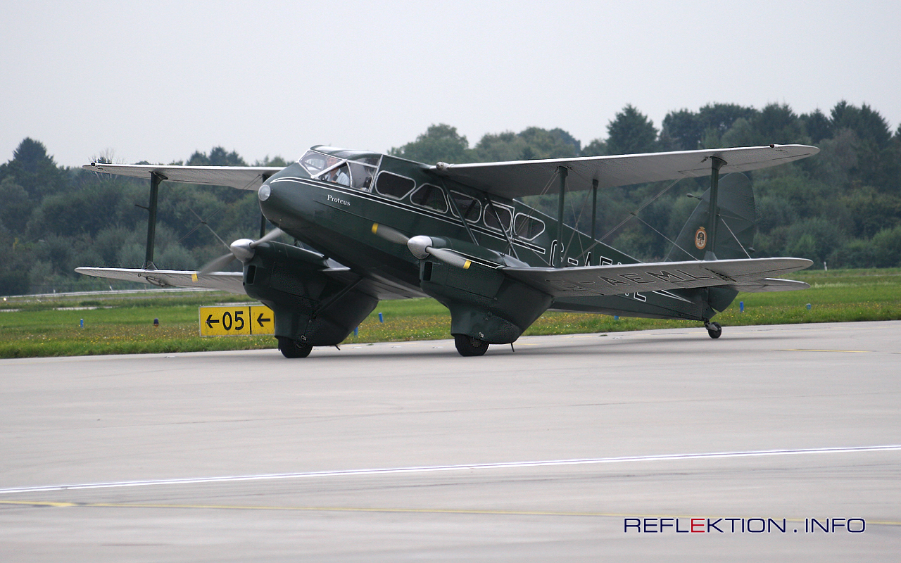 DeHavilland D.H. 89a DRAGON RAPIDE G-AEML Vor 76 Jahren, im September 1936 wurde die DRAGON RAPIDE an die Fluggesellschaft WRIGHTWAYS geliefert. Vom damaligen Londoner Flugplatz Croydon startete die Maschine mit 2 Mann Besatzung und bis zu 8 Passagieren im europäischen Liniendienst. Bei einer Höchstgeschwindigkeit von rund 250 km/h kam die RAPIDE gut 800 Kilometer weit. 1993 wurde die D.H. 89a grundüberholt und in den Originalfarben lackiert. Im September 2007 war sie Gast bei den Hamburg Airport Days