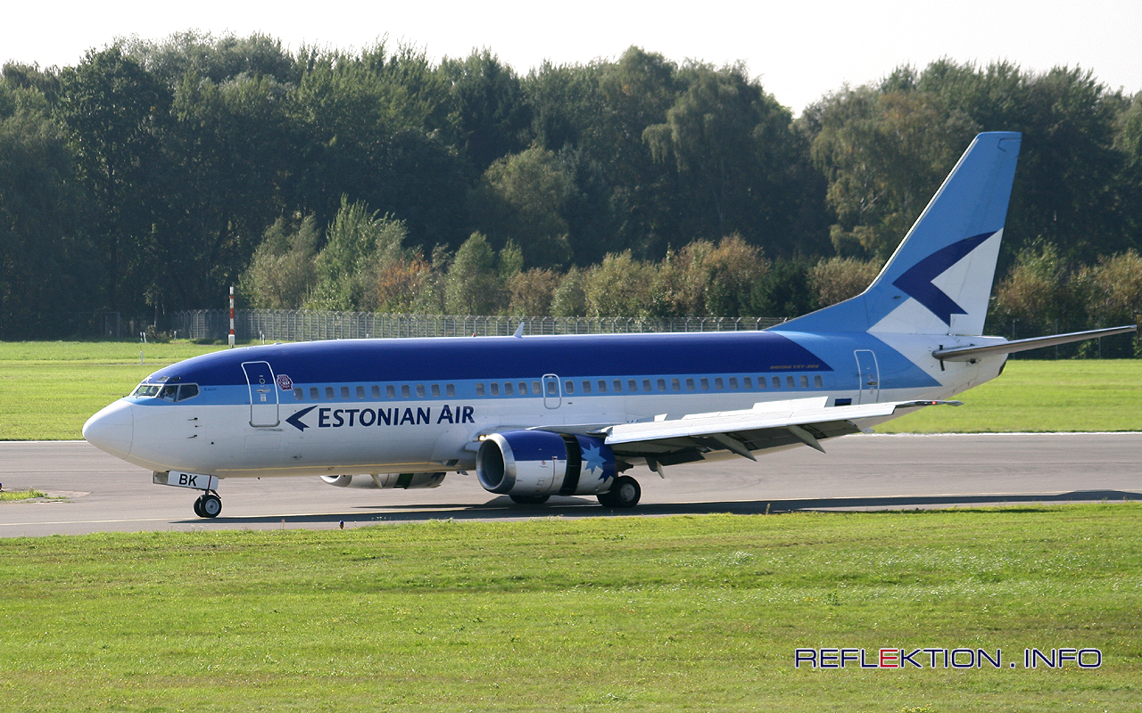 ESTONIAN AIR BOEING 737-300 ES-ABK ESTONIAN AIR fliegt mit einer Flotte aus 5 BOEING 737 (3 737-300 und 2 737-500) rund 20 Ziele in der EU sowie Moskau und Minsk (Weißrussland) an. Dreimal wöchentlich wird die Linie Talinn - Hamburg bedient. Nach der Landung in Hamburg-Fuhlsbüttel ist an den geöffneten Triebwerken die eingeschaltete Schubumkehr deutlich zu erkennen.