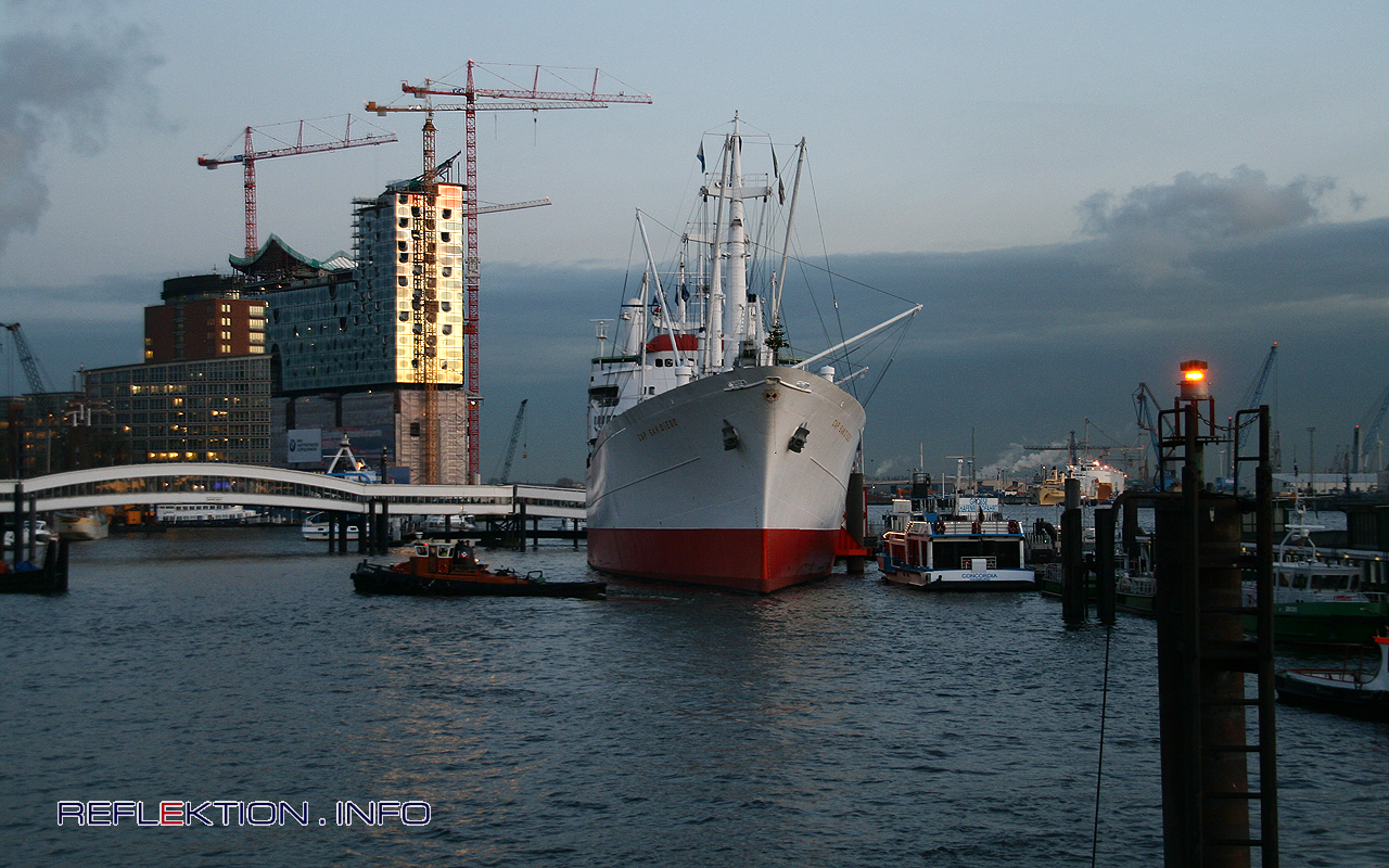 CAP SAN DIEGO Das größte betriebsfähige Museumsschiff der Welt, die CAP SAN DIEGO liegt vertäut an der Überseebrücke im Hamburger Hafen. Dahinter wächst Hamburgs neues Wahrzeichen: die Elbphilharmonie. Eigentlich sollte der Bau ja schon eine komplette Konzertsaison absolviert haben. Leider hat sich die Hamburger Regierung nicht nur in Bezug zur Zeitplanung recht naiv blenden lassen, sondern in noch größerem Maße gilt dies für die Kostenexplosion. So wird der Umbau des ehemaligen Kaispeichers für Margarine und andere Fette am Ende gut 300 Millionen Euro mehr als zu Baubeginn angenommen kosten. Es ist sicherlich zu begrüßen, daß Hamburg eine weitere Attraktion bekommt. Leider ist der Preis unangemessen hoch, so daß auch noch keine ernsthafte Renditerechnung vorgelegt wurde. So schamlos ist die derzeitige Regierung nun doch nicht.