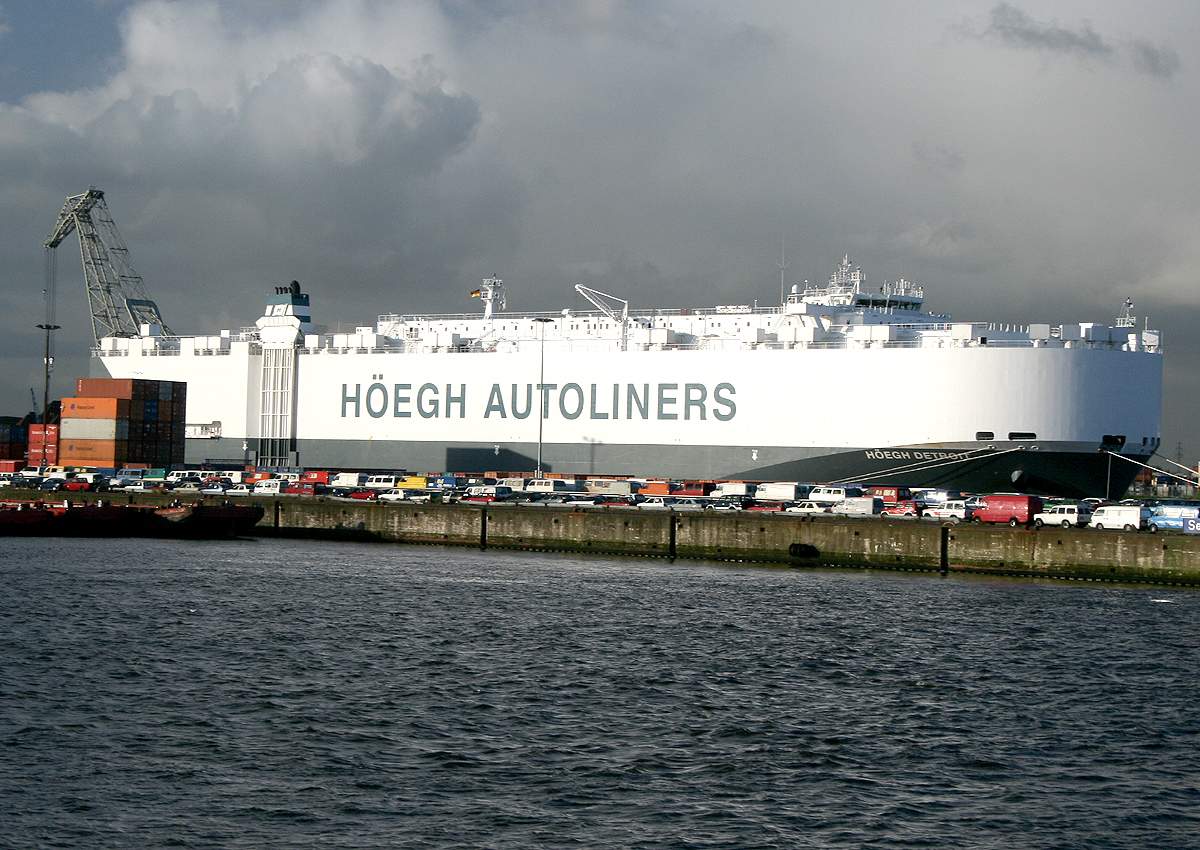 CaCa-Frachter (Car Carrier) HÖEGH DETROIT am Unikai / O’swaldkai in Hamburg. Die Reederei Höegh Autoliners fährt für viele Autohersteller die Neuwagen über die Weltmeere. Zusätzlich werden auch Gebrauchtwagen transportiert. Die HÖEGH DETROIT fährt zweimal monatlich von Jacksonville und Baltimore nach Europa. Ausgeladen wird meist in Amsterdam, Bremerhaven, Southampton und Le Havre. Der O’swald- /Unikai in Hamburg ist für HÖEGH AUTOLINERS nur selten das Ziel.