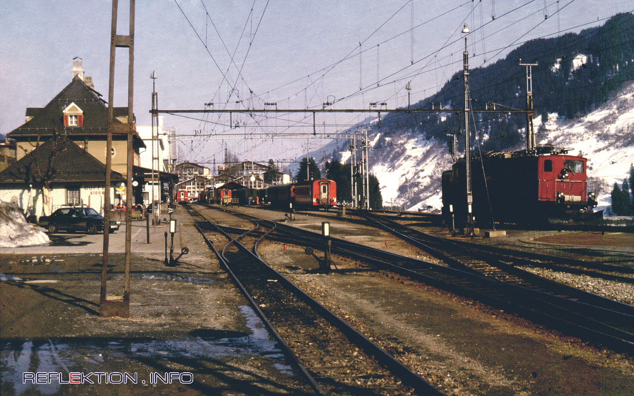 FURKA-OBERALP BAHN - RHÄTISCHE BAHN - BAHNHOF DISENTIS/MUSTÉR Der 2100-Einwohner-Ort im westlichen Graubünden wird überragt vom Kloster Disentis, einer Abtei der Schweizerischen Benediktinerkongregation. Davor befindet sich der bedeutende Bahnhof der Rhätischen Bahn (RhB). Der Bahnhof gehört der RhB, den Betrieb teilt sie sich mit der MGB bzw. FO. Hier endet die in diesem Jahr 100 Jahre alt werdende Strecke in Richtung Osten nach Chur. Nach Westen in Richtung Andermatt wird die Bahnlinie von der aus der Furka-Oberalp Bahn (FO) und der Brig-Visp-Zermatt Bahn (BVZ) entstandenen Matterhorn-Gotthard Bahn (MGB) weitergeführt. Zur Zeit der Aufnahme - vor 25 Jahren - war die FO noch selbständig. Lediglich eine Lok, die FO HGe 4/4 31, ist zu sehen.Die Zahnradloks HGe 4/4 31-36+37 waren damals das Rückgrat der FO und übergaben bzw. übernahmen hier auch den Glacier Express an bzw. von der RhB.