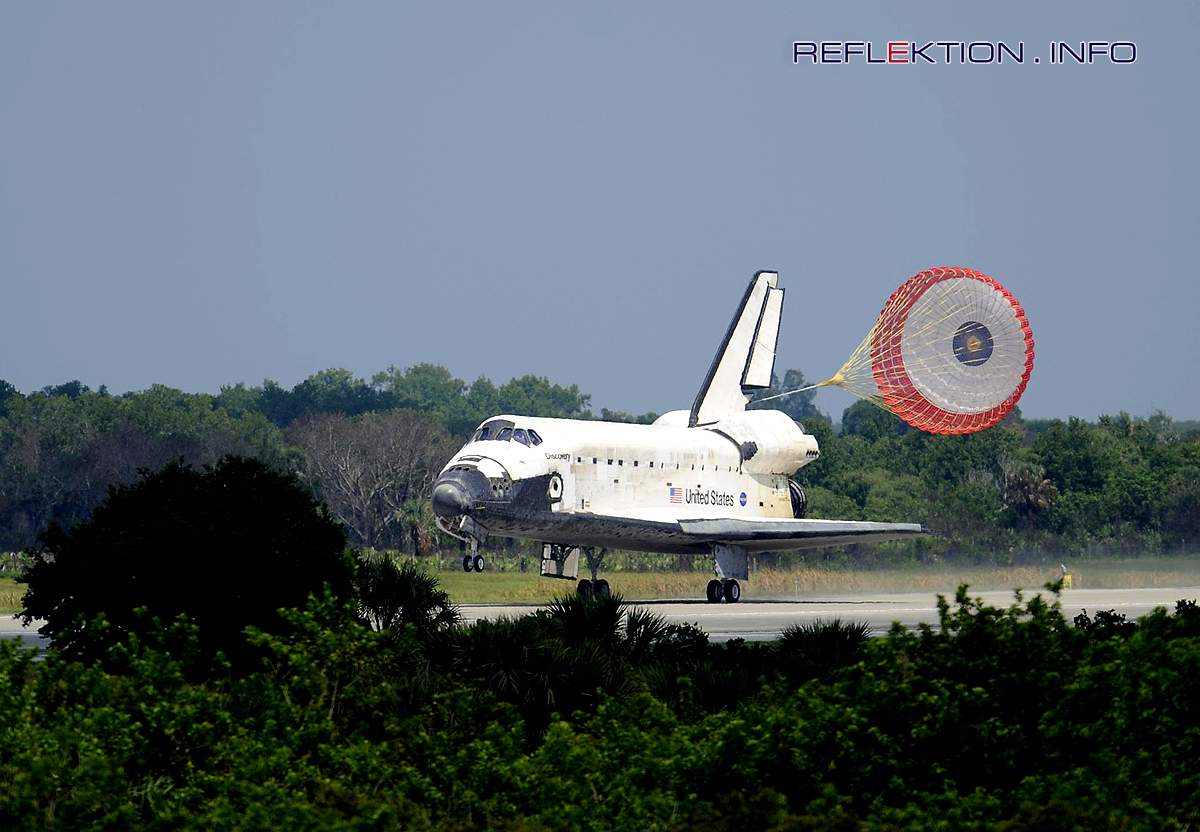 DISCOVERY landet! Das Space Shuttle DISCOVERY setzt um 11:15 Ortszeit (17:15 Uhr MESZ) am Samstag, dem 14.6.2008 am Kennedy Space Center in Florida auf. Währens der dreizehntätgigen Mission wurden neue Komponenten an der Internationalen Raumstation ISS montiert. Zu Beginn der Rückkehr zur Erde hatte ein sich von der Raumfähre entfernender, rechteckiger, rund 30 mal 40 Zentimeter großer Gegenstand zu Aufregung geführt. Die Bodenkontrolle wertete die Foto- und Filmaufnahmen aus und beschloß, daß es nicht um ein wichtiges Teil handele. Wahrscheinlich sei es ein Teil aus dem Umfeld der Bremsraketen, dessen Fehlen unproblematisch sei. So war es denn auch, wie eine Kontrolle nach der sicheren Landung ergab. Siehe dazu auch...
