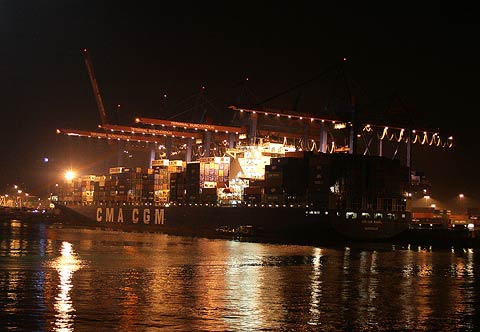 Containerfrachter CMA CGM RAVEL Die Reederei CMA CGM ist die drittgrößte Containerschiff-Reederei der Welt. 7 Schiffe der in Marseille ansässigen CMA CGM kommen wöchentlich im festen Fahrplan nach Hamburg. Die RAVEL liegt für maximal 36 Stunden im Waltershofer Hafen am Container Terminal Burchardkai. Um die kurzen Liegezeiten einhalten zu können, wird 24 Stunden an 7 Tagen in der Woche be- und entladen. Das Schiff verkehrt im Linienverkehr nach Asien und erreicht Hamburg rund viermal jährlich. Die RAVEL wurde 2001 bei Daewoo Heavy Industries. als W-Nr. 4072 gebaut. IMO-Nr. 9221839 Länge: 300,15 m, Breite: 40,10 m, Tiefgang: 14,52 m Kapazität: 6712 TEU (20-Fuß-Container) Tonnage: 73.059 BRT Maschine: MAN B&W 12K-98MC-C, Leistung: 68.536 KW, 1 Propeller Geschwindigkeit max. 25,8 Knoten (48 km/h) Eigentümer & Reederei: CMA CGM Heimathafen: Marseille / Port aux Francais