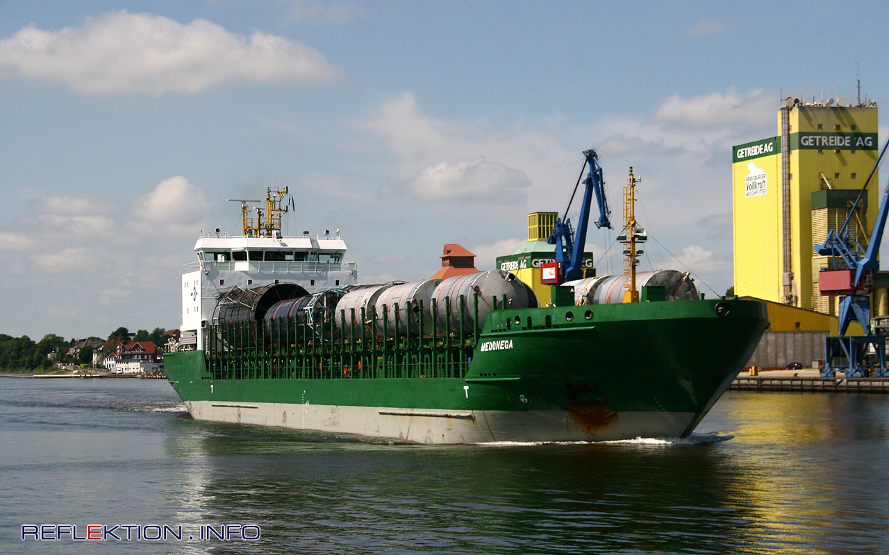 Mehrzweckfrachter MEDONEGA Die MEDONEGA ist von Brunsbüttel kommend auf dem NORD-OSTSEE-KANAL nach Kiel unterwegs und passiert den Rendsburger Hafen auf Höhe der Rendsburger Hochbrücke. Mit der Decksladung aus Kesseln ist das Ziel Schweden. Der Mehrzweckfrachter ist 2008 in China gebaut worden und auf Zypern in Liamssol registriert. Das 119,30 Meter lange und 16,50 Meter breite Schiff hat einen maximalen Tiefgang von 6,28 Metern. Die Hauptmaschine leistet 3000 kW und treibt das Schiff mit bis zu 12,5 Knoten (23 km/h) voran. Beim Containertransport sind Stellplätze für 331 20-Fuß-Container, davon 20 mit Kühlanschluß vorhanden. Bereedert wird die MEDONEGA von REIDER SHIPPING BV im niederländischen Winschoten.